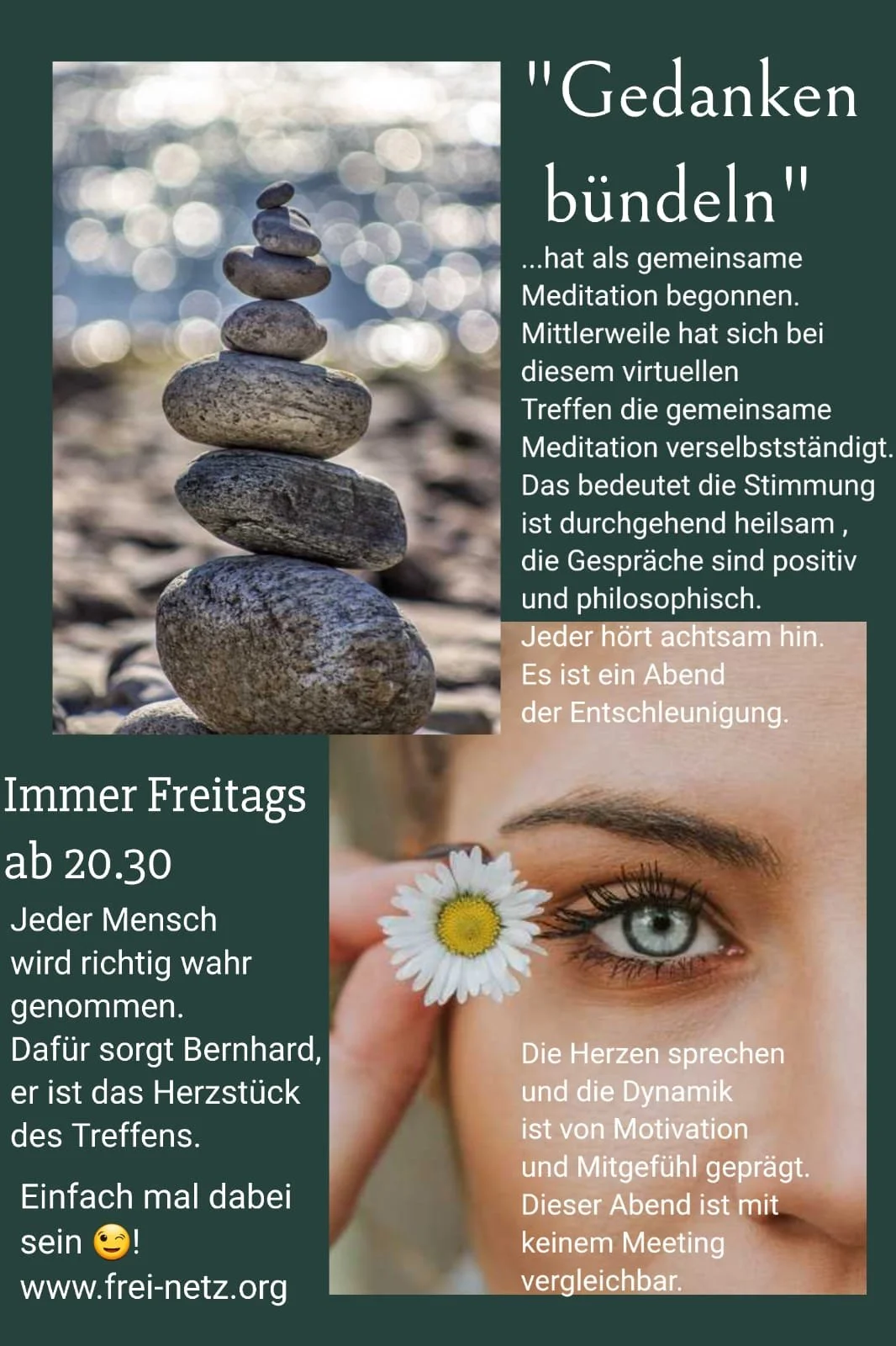 Gedanken bündeln Freitag, 13. August 2021 8:30 PM 9:30 PM 20:30 21:30 Google Kalender ICS Wo Menschen sich begegnen - MITEINANDER und FÜREINANDER.Toll wenn Du dabei bist!Link zum Zoom-Meeting Meeting-ID: 514 482 2960Kenncode: 145583