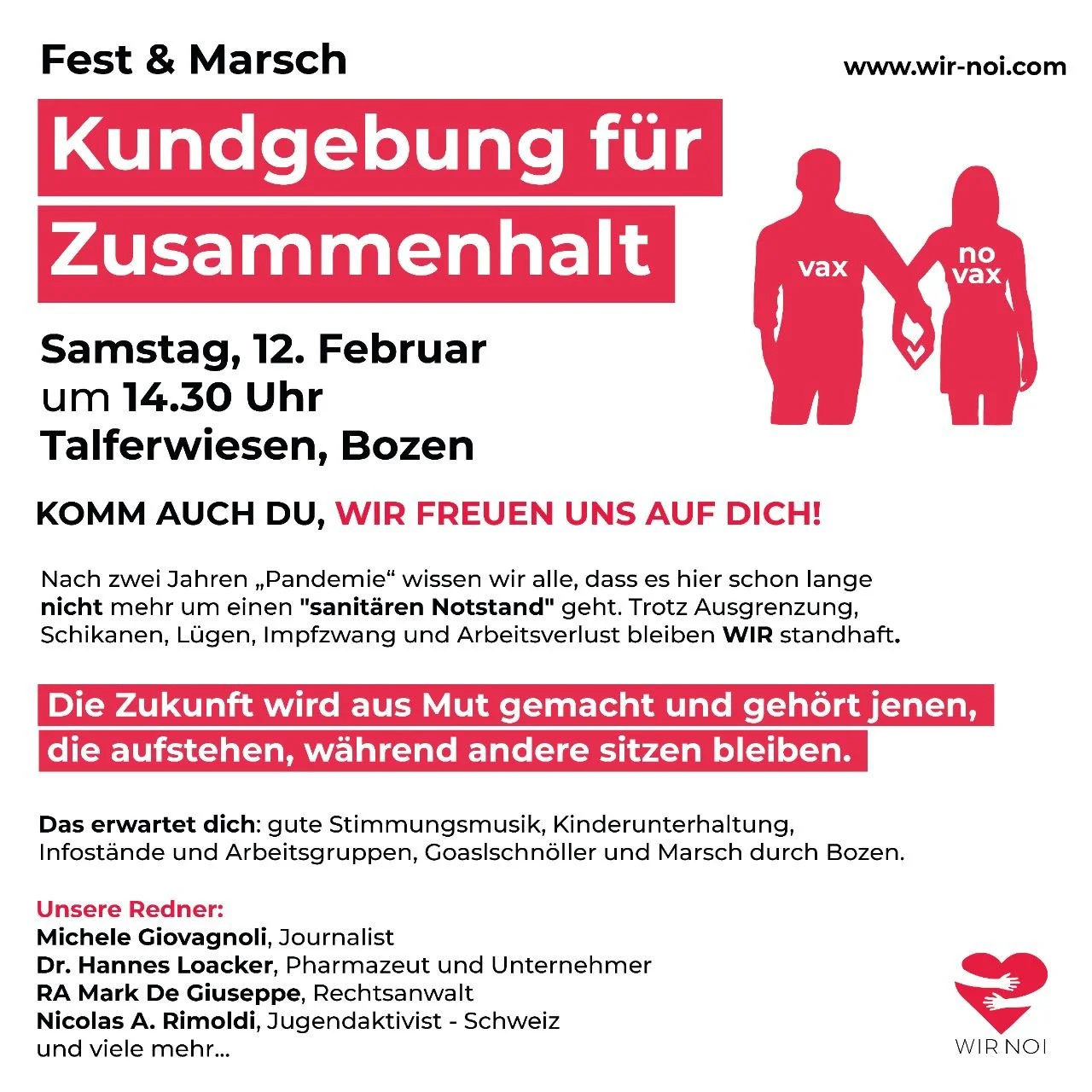 Kommt alle am Samstag, den 12. Februar um 15:00 Uhr nach Bozen auf die Talferwiesen zur Großkundgebung gegen die Coronapolitik!