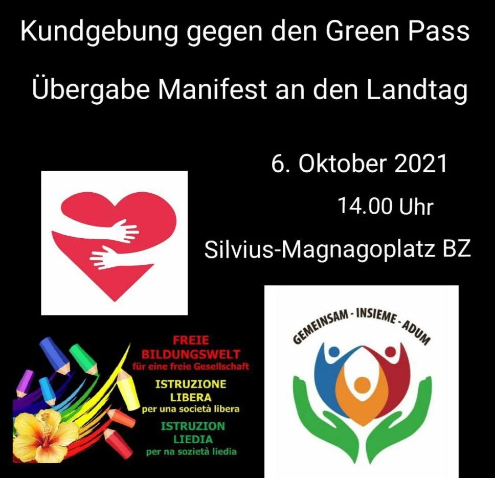 Am kommenden Mittwoch, den 6.10.2021 um 14 Uhr, versammeln wir uns auf dem Silvius-Magnago-Platz, um aufzuzeigen, wie diskriminierend dieser Green Pass ist und machen darauf aufmerksam, dass wir uns gegen ihn wehren werden!