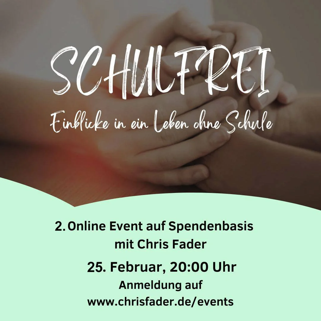 Der 1. Online-Event über das Thema "Schulfrei" war ein großer Erfolg. Viele konnten jedoch nicht live dabei sein, weshalb Chris Fader nun ein zweites Event am 25.02.2023 um 20:00 Uhr veranstaltet. Fragen, bzw. Antworten aus dem ersten Event werden direkt mit einfließen und Du wirst zudem im Anschluss an das Event Zugang zur extra dafür gegründeten Telegram-Gruppe bekommen, um dich noch weiter austauschen, vernetzen und verbinden zu können.