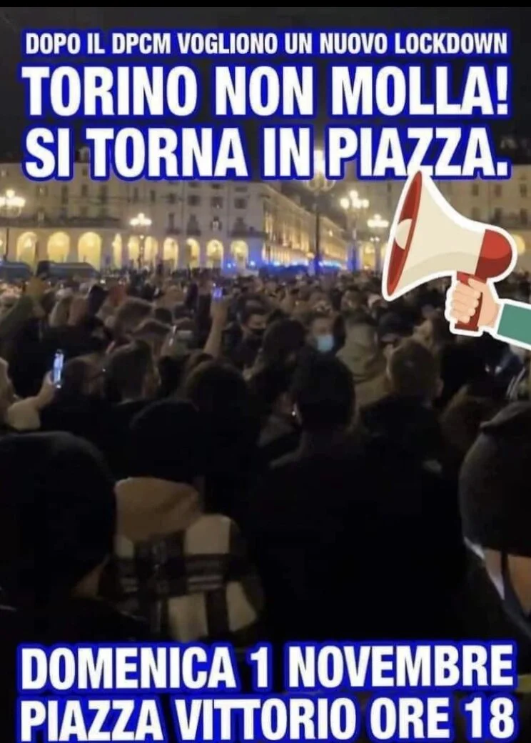 Dimostrazione a Torino il 1. Novembre 2020 dalle ore 18 in Piazza Vittorio.