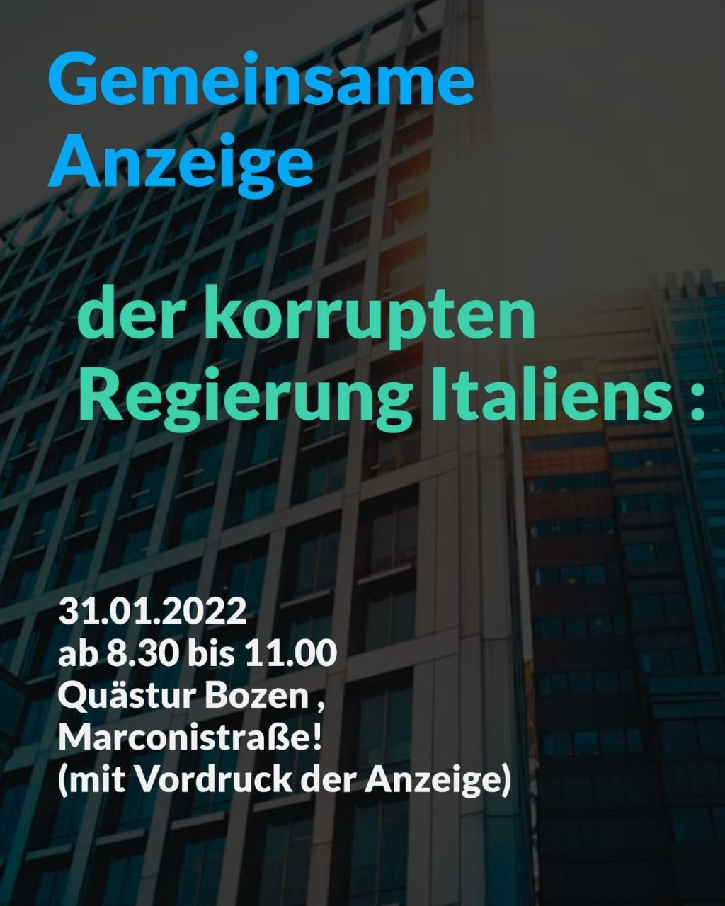 Wir treffen uns ab 8.30 Uhr gemeinsam vor der Quästur in Bozen. Lasst uns viele sein: geimpft, ungeimpft und jeder mit seiner ausgedruckten und ausgefüllten Anzeige ausgerüstet.