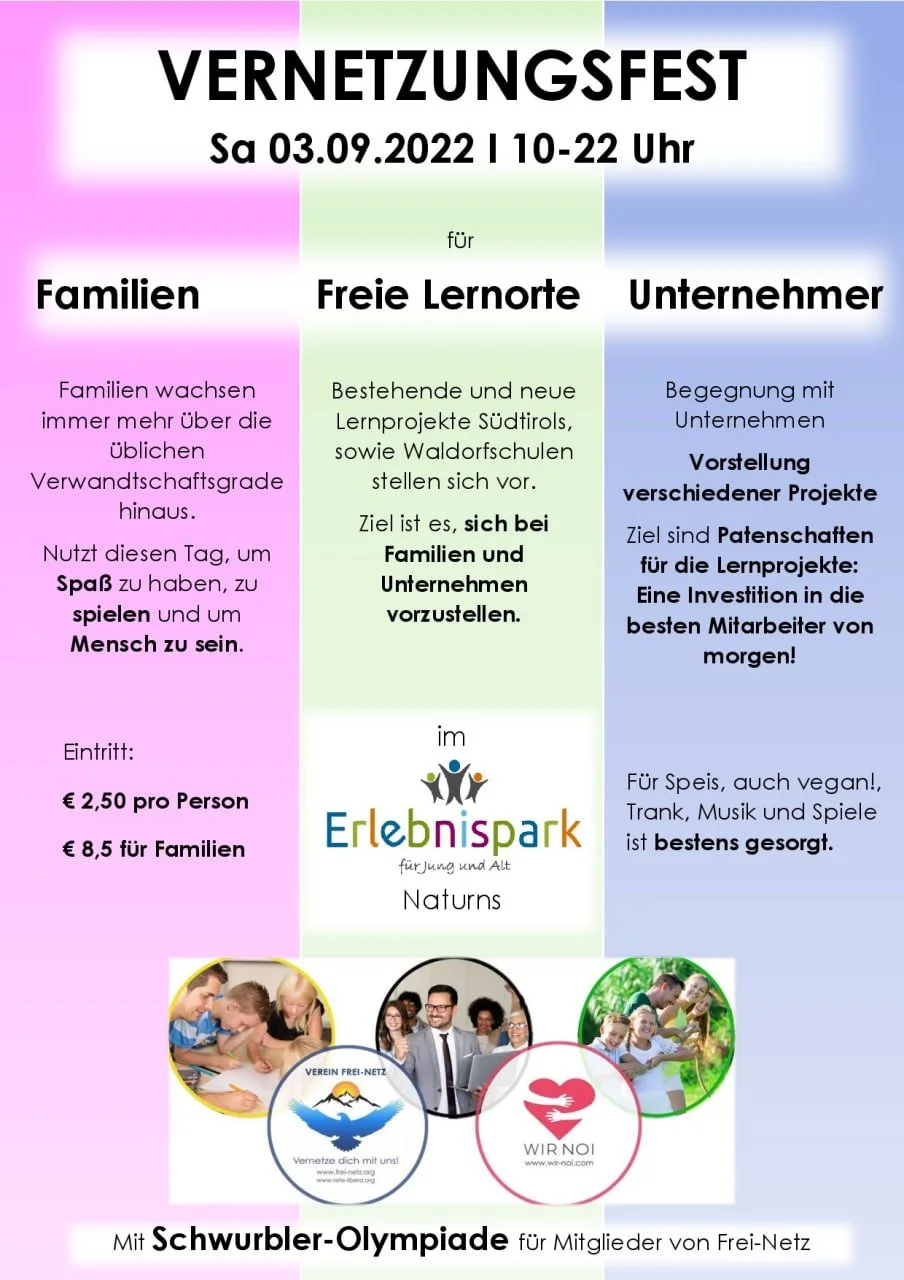 Am Samstag den 03.09.2022 treffen sich Familien, Lernorte und Unternehmer zum großen Südtiroler Vernetzungsfest im Erlebnispark Naturns. Sei auch du dabei!