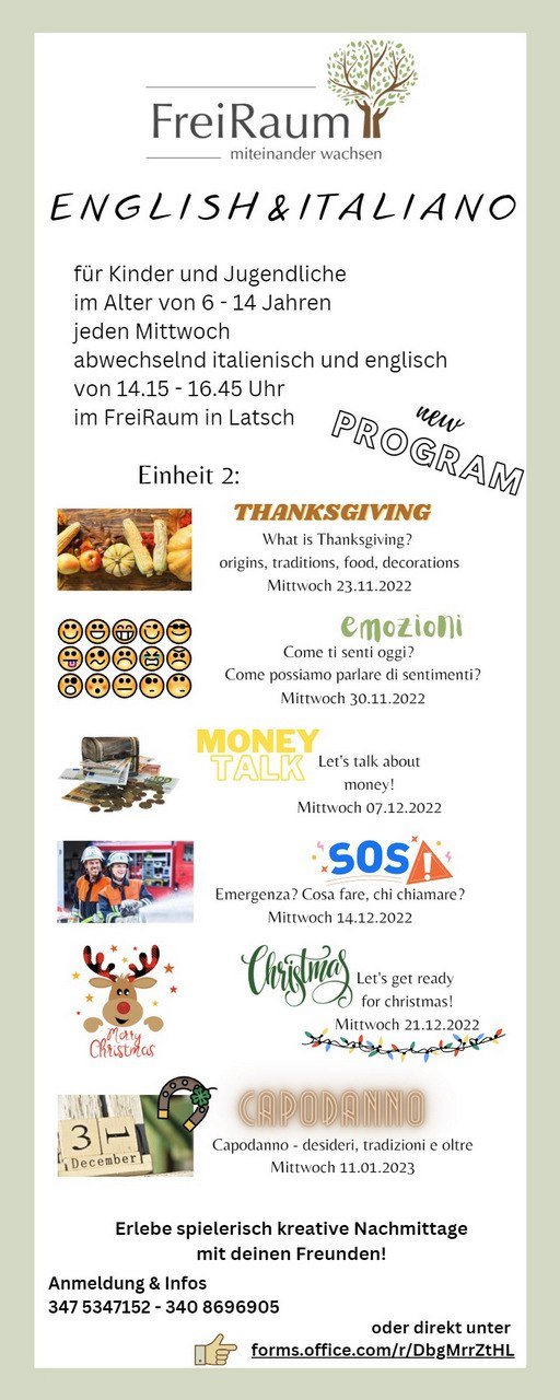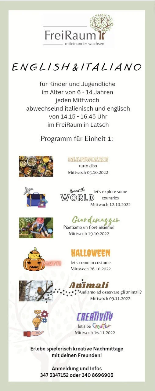 Erlebe mit deinen Freunden kreative Nachmittage zu verschiedenen Themen entsprechend der Jahreszeiten und den dazugehörenden Festen. Ob an Halloween im Kostüm Kürbis ausschnitzen, zur Weihnachtszeit Kekse backen oder an Fasching eine Party steigen lassen. Viel Spaß und Abwechslung ist garantiert! Die Nachmittage werden abwechselnd in italienischer & englischer Sprache begleitet.