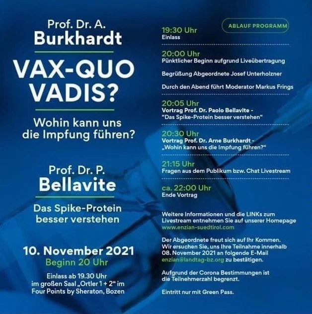 Live-Mitschinitt des Vortrags der Pathologen Prof. Dr. A. Burkhardt und Prof. Dr. P. Bellavite am 20. November 2021 in Bozen.